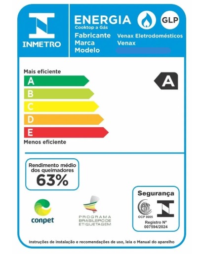 Potência Queimador: 1,35kW, (queim. médio)